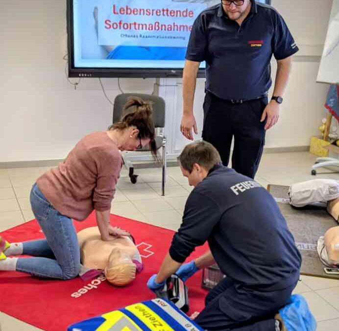 Alle Teilnehmenden trainierten intensiv die Wiederbelebung als Ersthelfer an Reanimationspuppen und konnten dabei ihr Wissen auffrischen und vertiefen. In der letzten Stunde lag der Fokus auf unseren First Respondern: Mit der umfangreich zur Verfügung stehenden rettungsdienstlichen Ausrüstung wurden die aktuellen Algorithmen der Wiederbelebung bei Kreislauf- und Atemstillstand nach den neuesten Reanimationsleitlinien trainiert.